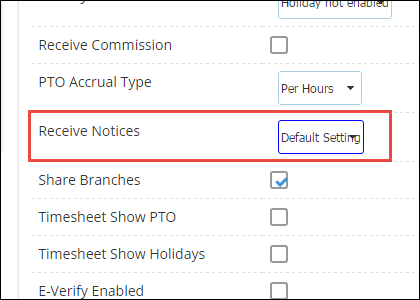 "Receives Notices" is now an option when creating or editing an employee type profile. Options for this are to respect the default setting in the control, or override this setting with yes and no options.