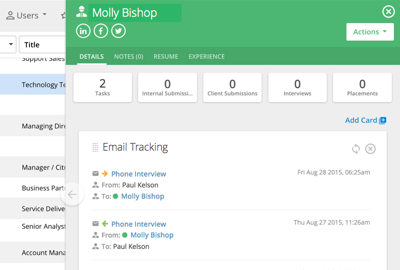 The Email Tracking card has been added to the Candidate slideout. The “Email Tracking” card allows users to easily view email correspondence at a glance by launching the slideout from the Candidate list.