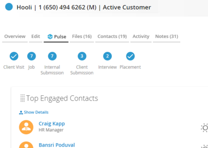 We have added a new “Pulse” tab to Candidate, Contact, and Company records, giving users more visibility to Pulse information. This new tab will display the Pulse information that was previously only accessible via the preview slideouts ...