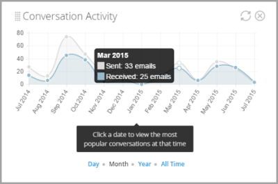 Track the history of your inbound and outbound email volume by Day, Month, Year, and All Time. Click to drill down and discover what conversations required the most communications.