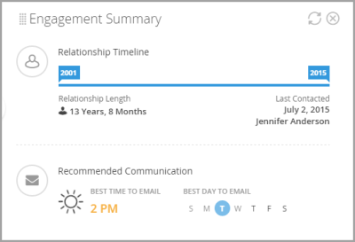 Gain valuable insights into your relationships that will allow you to maximize engagement and retain customer health. Details include length of relationship, date last contacted, best time of day to email and best day of the week to email.