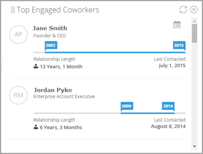 The Top Engaged Coworkers card will quickly show you who in your organization has the strongest relationship with a given contact. By determining who at your company has the longest relationship with the contact, as well as when they las...