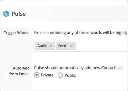In addition to the note action types that drive the Phone Conversation Activity card, administrators can now define the trigger words used for the Flagged Emails card. You access the Pulse Configuration page via the Tools menu. If you do...